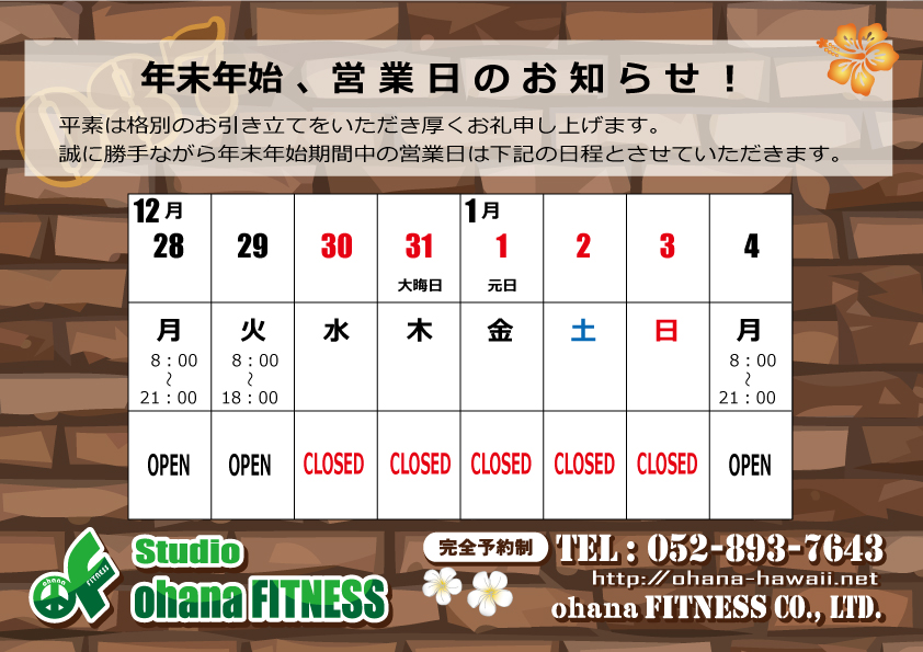 こんな時代ですがお陰様で皆様にご利用いただきまして2020年も営業していくことができました。2021年、また時代に合ったプログラムの提供、環境など整え、一層皆さまに利用していただけるよう、スタッフ一同、心を込めてエクササイズのご案内をしていきたいと思います。